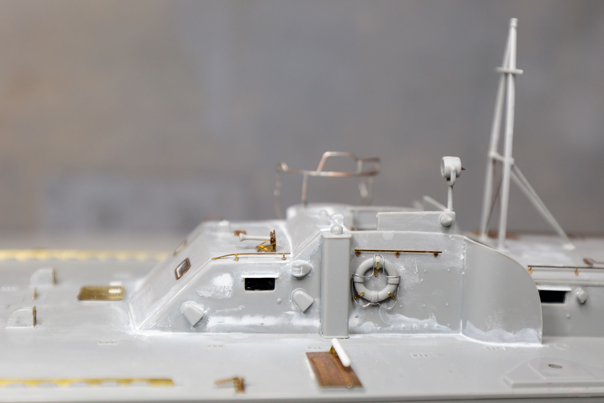 Продолжаю строить модель торпедного катера PT-109 в масштабе 1/72. Переделал пулемётные турели. Спилил имитации поручней, которые были выполнены полосками пластика по стенкам башен турелей. Вместо них поставил поручни, которые позаимствовал поручни лишнего набора фототравления. Заменил пластиковые ограждения турелей, поскольку они были слишком толстые. Новые ограждения изготовил из проволоки. Использовал мягкую медную проволоку, т.к. ее проще проще подгонять на место. Я никак не мог понять, зачем эти огородки. А потом до меня дошло, что это защита от дружеского огня своих же стрелков по катеру. Огородки поставлены так, чтобы стрелок не смог шмальнуть по мостику, мачте, другим огневым точкам катера. ЧИТАТЬ ДАЛЕЕ
