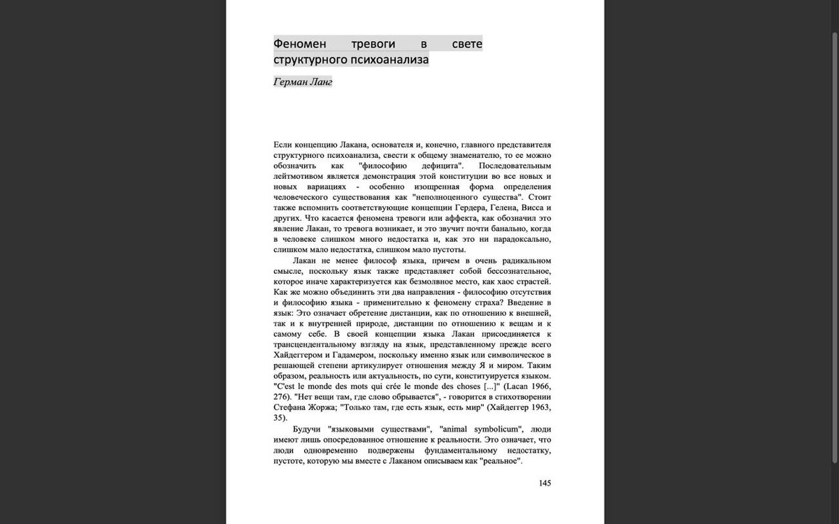 Феномен тревоги в свете структурного психоанализа, Герман Ланг Очень сырой, "технический" перевод с немецкого deepl-ом, сделан для себя, для озанакомления. А статья хорошая. Как всегда чтение лаканистов оставляет внутри какое-то смутное напряжение, неустранимый остаток, зазор, зияние и все такое... которое ищет разрядки. Она в сообщении выше. Ps. Выложил покрупнее текст.