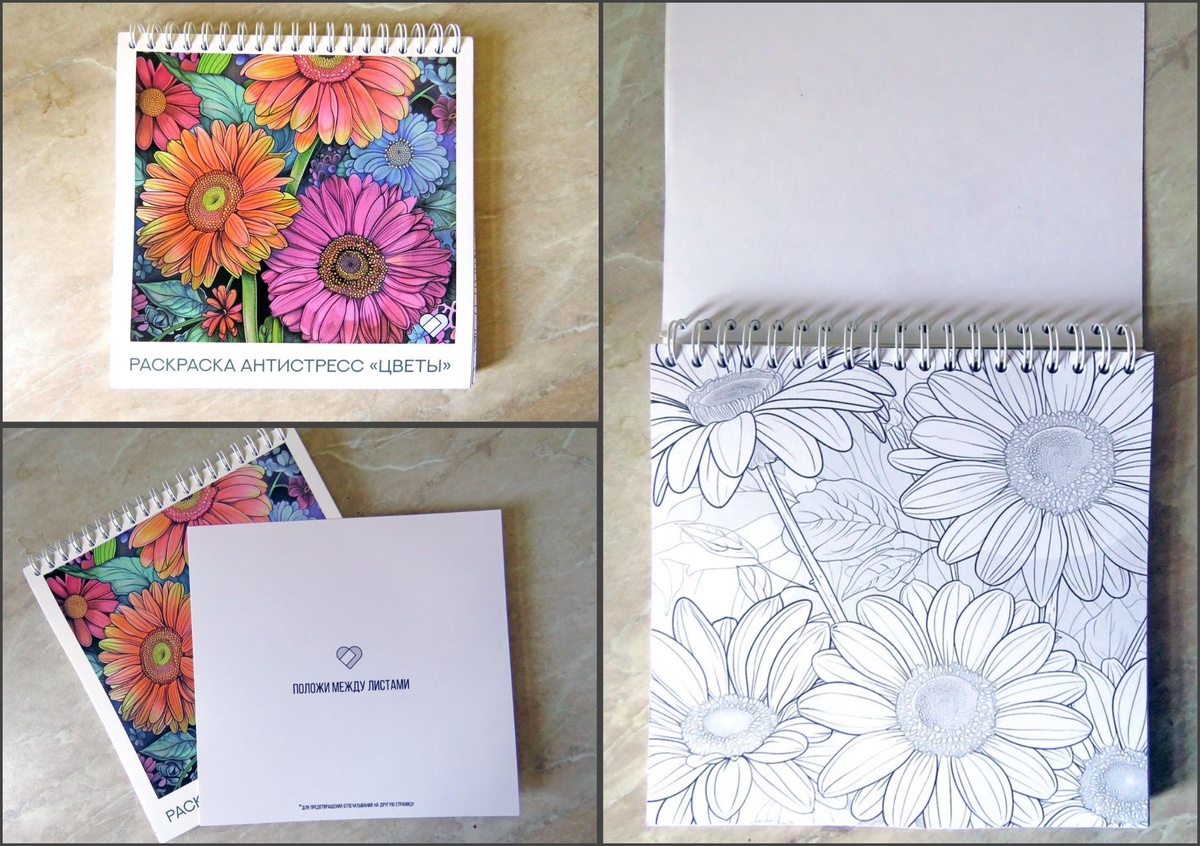 Лето – время цветов, но оно скоротечно. В «TIAMO PRESS» позаботились о том, чтобы цветы не вяли круглый год. Свою цветочную раскраску они отнесли к модному жанру «антистресс», однако нет здесь замысловатых виньеток, а изображения (их 60), не лишённые декоративности, всё же приближены к реалистичным. Формат альбома невелик, всего 17х17 см, но он удобен, поскольку книжечка может легко уместиться даже в маленькой сумке. Кроме того, при работе над рисунком не слишком большого размера, можно быстрее получить результат. Крепление на спираль позволяет перегибать блокнот и при необходимости работать на развороте. Впрочем, и здесь создатели позаботились об удобстве: печать односторонняя, плотность бумаги 170г/м2, а это расширяет возможности при выборе материала (даже если чернила или краска просочатся на обратную сторону, ничего не будет испорчено). В дополнение прилагается плотный вкладыш, который можно проложить между листами, чтобы защитить следующее изображение Меня же в первую очередь прив