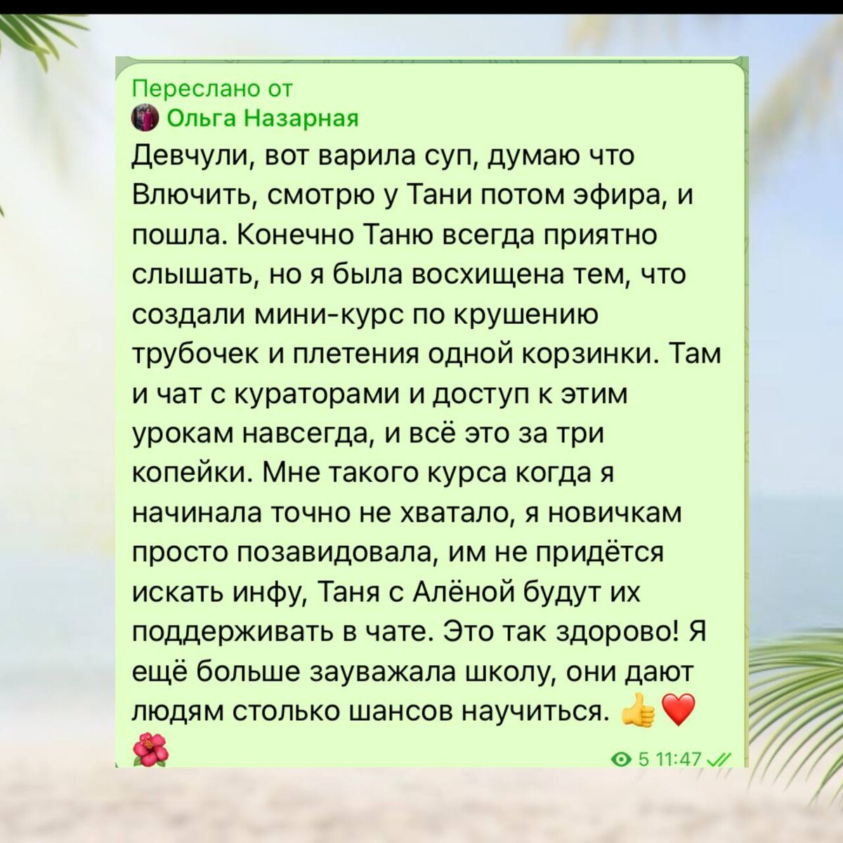 Девчули, вот варила суп, думаю что включить, смотрю у Тани потом эфира, и пошла. Конечно, Таню всегда приятно слышать, но я была восхищена тем, что создали мини-курс по крушению трубочек и плетения одной корзинки. Там и чат с кураторами и доступ к этим урокам навсегда, и всё это за три копейки. Мне такого курса когда я начинала точно не хватало, я новичкам просто позавидовала, им не придётся искать инфу, Таня с Алёной будут их поддерживать в чате. Это так здорово! Я ещё больше зауважала школу, они дают людям столько шансов научиться. 👍❤️🌺