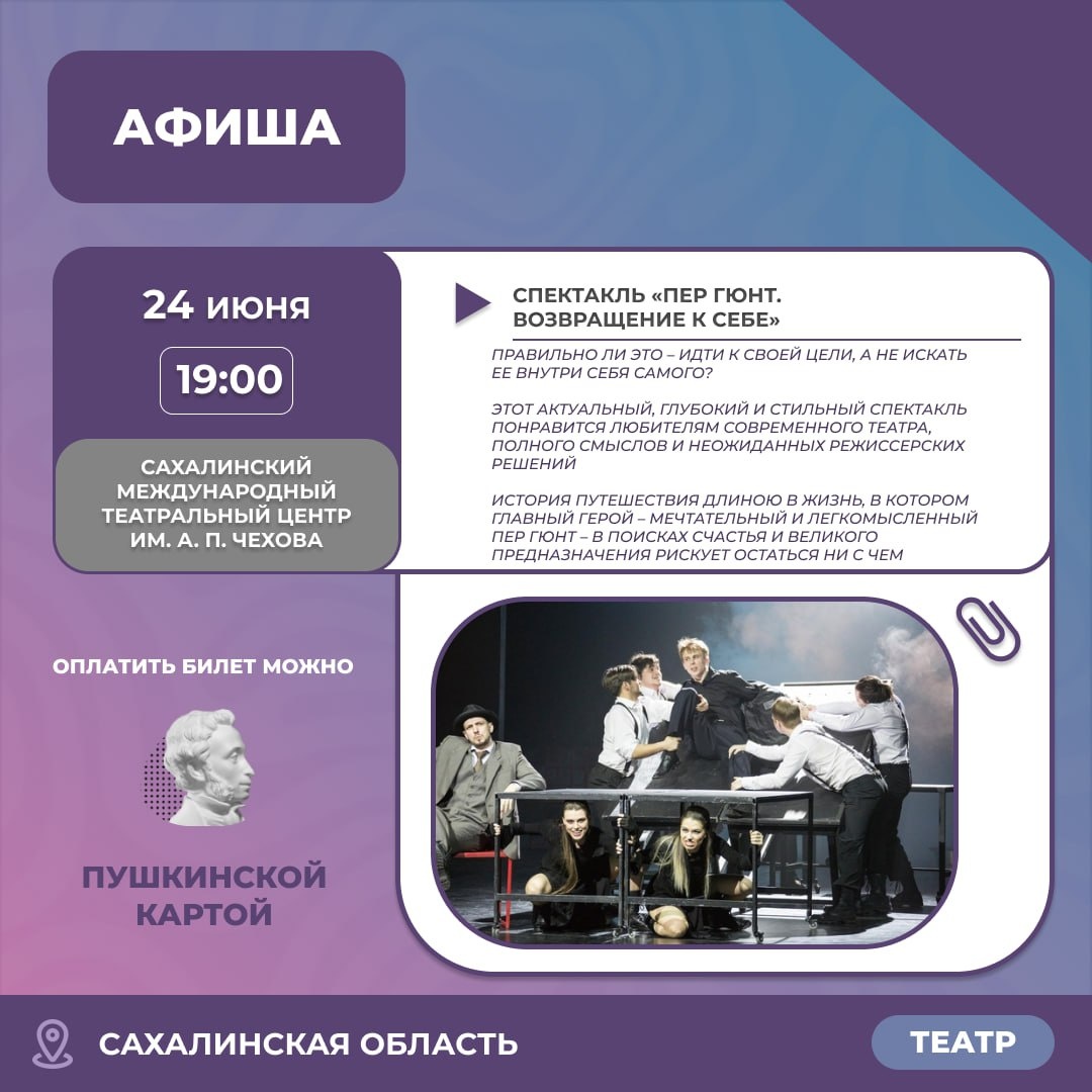 📢 Дорогие жители и гости Сахалинской области! 🎭 На следующей неделе запланированы захватывающие спектакли, которые подарят море эмоций и останутся в памяти каждого зрителя. Некоторые из постановок являются участниками Фестиваля театров Дальнего Востока.☝️ #сахалинскаяобласть #сахалин #афишамероприятий