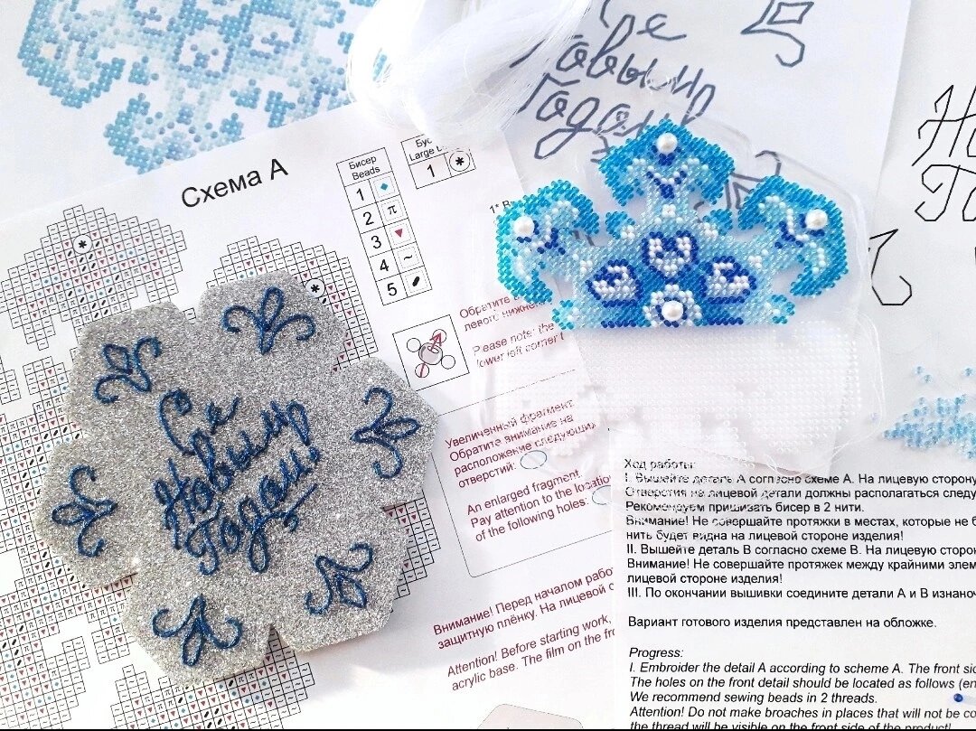 5 цветов мулине ПНК им.Кирова, фетровая заготовка синего цвета, серебристый фетр с глиттером, бисер, стразы, ленты атласны.