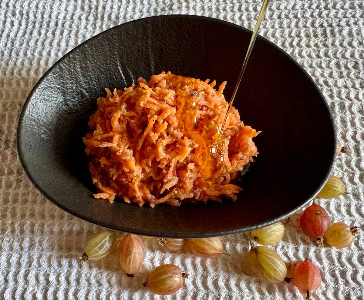 Морковный салат с заправкой из крыжовника и мёда Прекрасный салат в дни сухоядения. У кого крыжовник не поспел берите на заметку. Ингредиенты: 1️⃣ Морковь - 2-3 средние 2️⃣ Крыжовник - 1 стакан 3️⃣ Мёд - 1 - 2 ст.л (зависит от того насколько кислый крыжовник) 4️⃣ Молотая корица - 1 ч.л Приготовление 1. Морковь натрите на мелкой тёрке 2. Крыжовник с мёдом перебейте блендером 3. Заправьте получившимся «соусом» морковь. Добавьте корицы и перемешайте Ангела за трапезой! Ваш ПП - Православное Питание - канал о Пище, не только телесной, но и духовной #пост #сухоядение #салат #морковь #ягоды #крыжовник #просто #мёд #корица