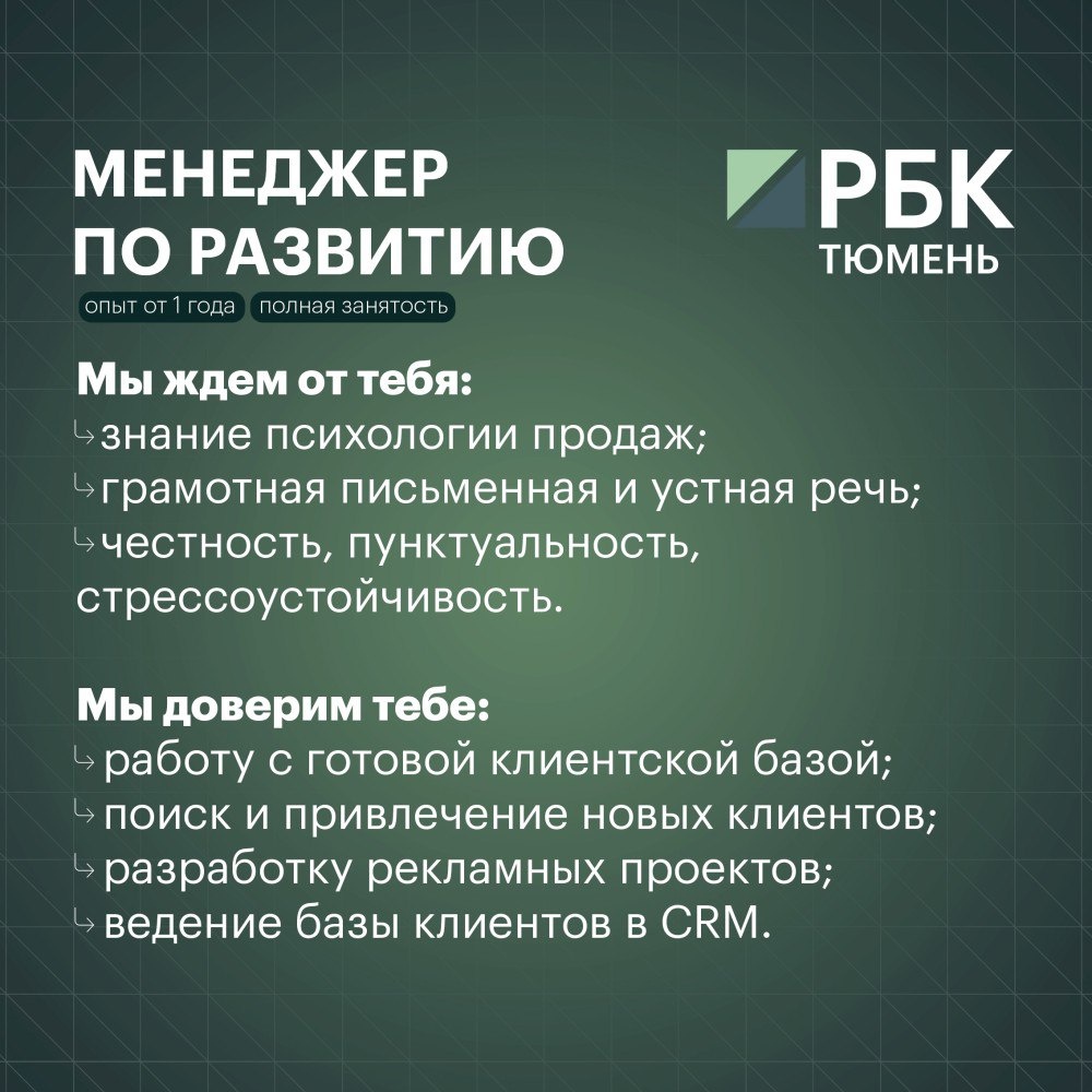 ❗️Вакансия в РБК Тюмень! Мы ищем менеджера по продажам Предлагаем интересную и перспективную работу, белую зарплату, корпоративное обучение и ДМС со стоматологией после прохождения испытательного срока. Если вас заинтересовало предложение, пишите @ArashkievaOlga. Розыгрыш билетов на летние фестивали