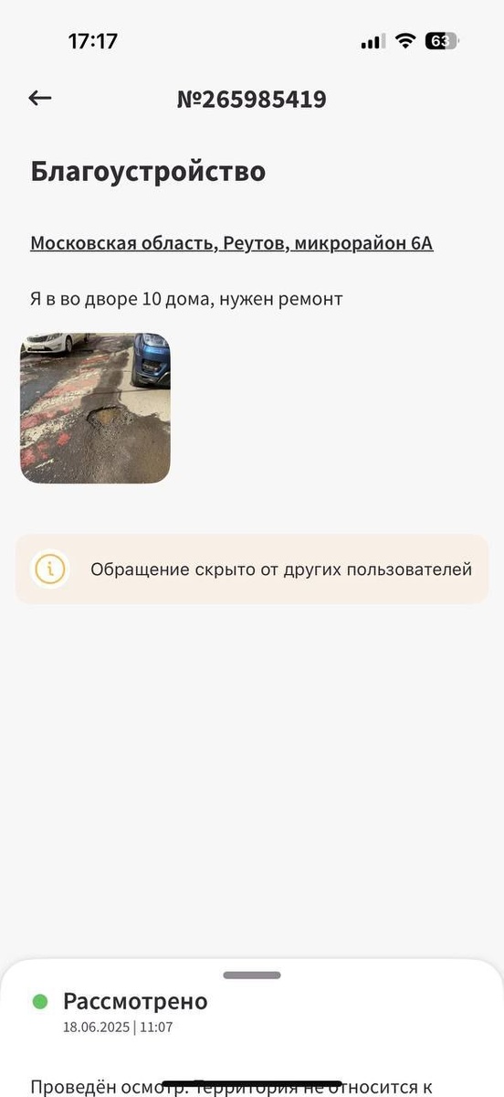 🗣Вниманию читателей! Было 2 заявки по одному адресу Реутовских ополченцев 10! Ямы одни и те же, одна в апреле подана, другая на днях, потому как с апреля ответа не было! И вот счастье, они рассмотрели в один день обе но сроки одних и тех же ям в одном и том же дворе разные 😤 #отподписчиков 🤩 Подписаться | Прислать новость | ВКонтакте | Дзен | Чат