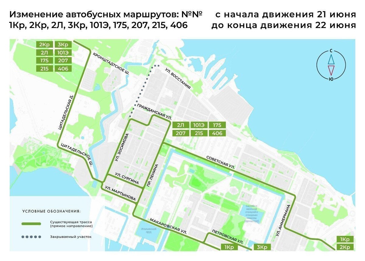 В Петербурге в связи с ремонтом дорожного покрытия на улице Зосимова и Липовой аллее вносятся изменения в движение маршрутов пассажирского транспорта, сообщили сегодня в пресс-службе «Организатора перевозок», Так, речь идёт об автобусах №1Кр, 2Кр, 2Л, 3Кр, 93, 101Э, 112, 175, 207, 215, 216А и 406 с начала движения 21 июня до конца движения 22 июня, а также маршрутах №1Кр и 101 с начала движения 23 июня до конца движения 24 июня. Ранее «Петербургский дневник» сообщал, что в Петербурге ограничат движение транспорта в пяти районах.