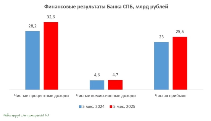 🧮 Банк Санкт-Петербург в последнее время демонстрирует солидные финансовые результаты, что делает актуальным анализ его бухгалтерской отчетности по РСБУ за первые 5 мес. 2025 года. Чем мы сейчас с вами и займёмся: 📈 Чистый процентный доход банка с января по май увеличился на +15,5% (г/г) до 32,6 млрд руб. Такой результат стал возможен благодаря активному наращиванию кредитного портфеля и высокой чистой процентной марже. Почти 40% фондирования приходится на счета «до востребования» со ставкой всего 0,01% годовых, что позволяет банку эффективно использовать «бесплатные деньги» в условиях жесткой денежно-кредитной политики Центробанка. Учитывая весьма осторожный подход нашего ЦБ к снижению ключевой ставки, Банк Санкт-Петербург сможет и дальше поддерживать высокий уровень процентной маржи, как минимум в течение текущего года. 💼 Кредитный портфель с января по май увеличился на +4,6% до 773,1 млрд руб. Как корпоративное, так и розничное кредитование демонстрируют хорошие темпы роста, позв