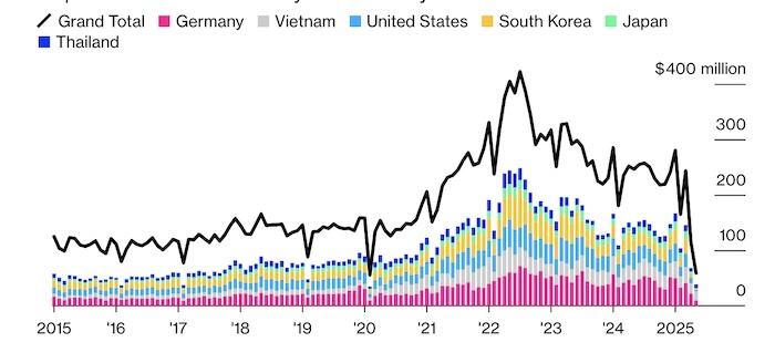 Китайский экспорт редкоземельных магнитов продолжил падать в мае, при этом поставки в США показали особенно резкое снижение из-за торговой войны с Вашингтоном Экспорт китайских магнитов упал на 76% в мае. Поставки в США снизились на 92% по сравнению с прошлым годом. Источник: Bloomberg Редкоземельные минералы и продукты, использующие эти элементы, оказались в эпицентре торгового конфликта, когда Китай ввел экспортные ограничения в ответ на карательные тарифы США, наложенные на китайские товары. С тех пор две страны стремились наладить отношения. Миротворческий процесс завершился встречей в Лондоне в начале июня, после которой президент США Дональд Трамп заявил, что вопросы вокруг редкоземельных элементов были решены. На Китай приходится около 90% мирового производства продуктов из редкоземельных элементов, большинство из таких продуктов — магниты. В ближайшие месяцы правительства и рынки будут следить за тем, ослабит ли страна экспортные ограничения после соглашения, достигнутого в Лон