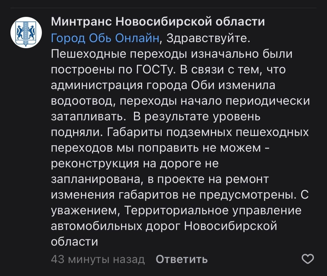 По поводу подземных переходов. Вот ответ министерства транспорта Новосибирской области. А где ответ администрации города Оби? Кто ответственен, почему изменили водоотвод? Кто наказан? Что вообще происходит? Вы почему к людям так наплевательски относитесь? Может и не стоит нам главу Павла Буковинина ставить, который в сеть выйти не может и пояснить по-человечески, что у него в вотчине происходит? Мозжерина добрым словом люди вспоминают. Он хоть и не был лучшим в мире мэром маленького городка. Но к людям выходил, как родной. И в субботниках участвовал и на праздниках всех присутствовал. И с людьми уважительно общался. Какие мысли по этому поводу, соседи? http://vk.com/ob.gorod?w=wall-100380192_524979