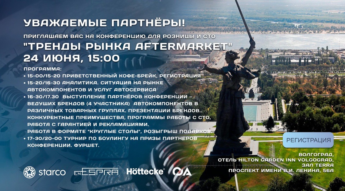 ⚡️Друзья! Приглашаем вас 24 июня 2025 года в 15-00 на конференцию «Тренды рынка автозапчастей и СТО». Адрес: Волгоград, Hilton Garden Inn Volgograd, зал TERRA, проспект имени В.И. Ленина, 56a Программа: 15-00-15-30 Приветственный кофе-брейк, регистрация 15-30-16-00 Аналитика. Ситуация на рынке автокомпонентов и услуг автосервиса. Честный знак и другие изменения. 16-00-17.30 Выступление партнёров конференции — ведущих брендов автокомпонентов в различных товарных группах. Презентации, конкурентные преимущества, программы работы с СТО и рекламациями. 💥17-30-20-00 Турнир по боулингу на призы партнеров конференции, фуршет. Бесплатно. Регистрация по ссылке: https://car-pr.timepad.ru/event/3388909/