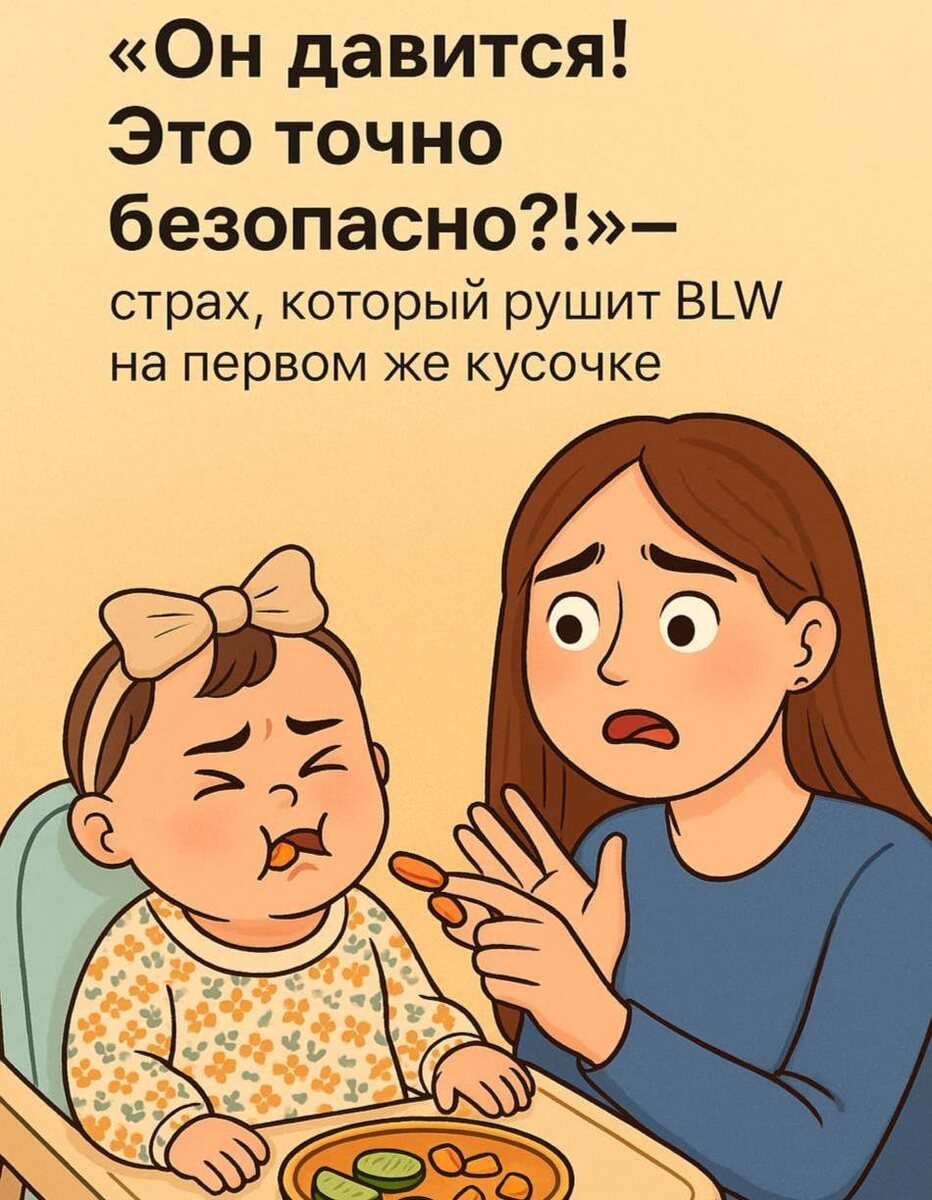 🐤🐤🐤🐤 Маленький человек берет кусок банана в ручку, тянет в рот, жует — и вдруг начинает кашлять, краснеть, выталкивать еду языком. Всё. Паника. Бабушка в обмороке. Папа лезет за аспиратором. Мама на грани слёз. А это... всего лишь гэг-рефлекс. Да, BLW — это красиво на видео, но в реальности первый опыт часто выглядит, как сцена из “Скорой помощи”. Только вот врачи не приедут — потому что никто не умирает, а просто работает защита организма. И вот здесь главный вопрос: 💬Мы готовы доверять ребёнку и его телу? Или доверяем только ложке и пюре, потому что там «надёжнее»? 💬 Много мам бросают BLW именно из-за страха. И дело не в том, что метод плохой, а в том, что мы — первое поколение, кто видит, как 6-месячный младенец жуёт огурец, а не кашицу из банки. 📌Давайте откровенно? Что вы чувствовали, когда впервые увидели, как ваш малыш “давится” на BLW? Отложили кусочки в сторону? Или продолжили, сжав кулаки? Давайте разберемся: страх — это инстинкт, но всегда ли он прав? Расскажи
