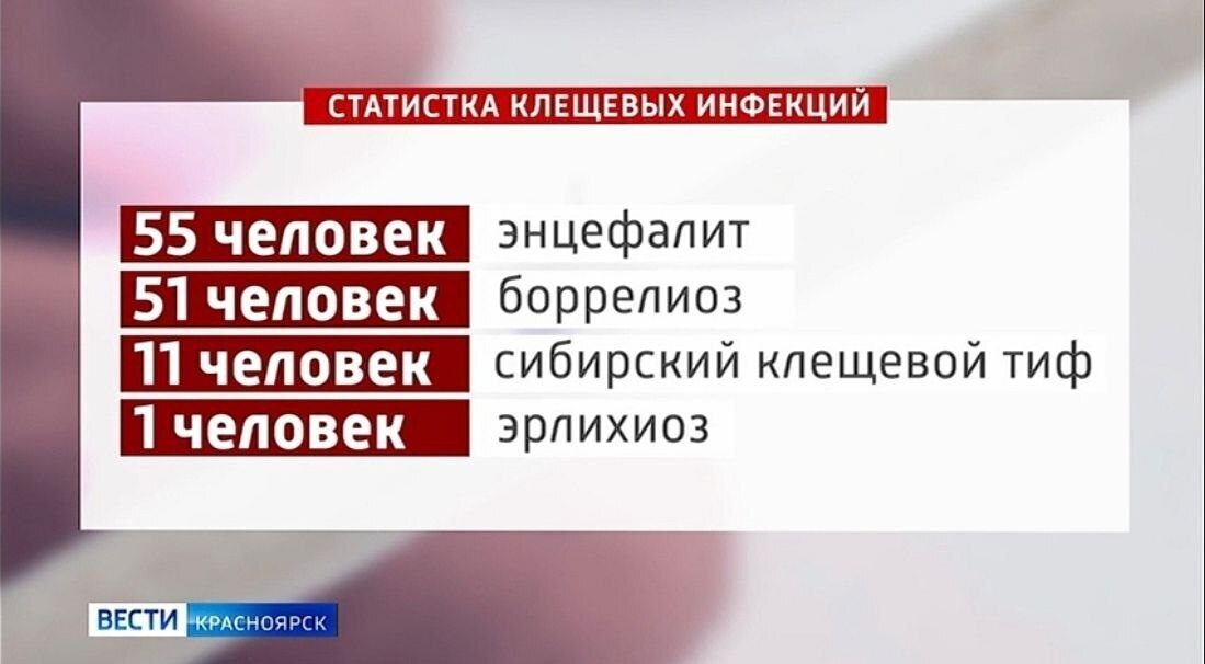 1506 жителей края сняли с себя клещей за последнюю неделю Среди них 277 детей. Всего с начала сезона на присасывание пожаловались 11,5 тысяч человек. По информации Роспотребнадзора, среди всех клещей обнаружено 118 инфекционных: 55 являются носителями энцефалита, 51 — боррелиоза, в 11 членистоногих выявлен сибирский клещевой тиф и в 1 эрлихиоз. Специалисты подчёркивают: активность клещей всё ещё остаётся высокой. @Источник: https://t.me/vesti_krsk