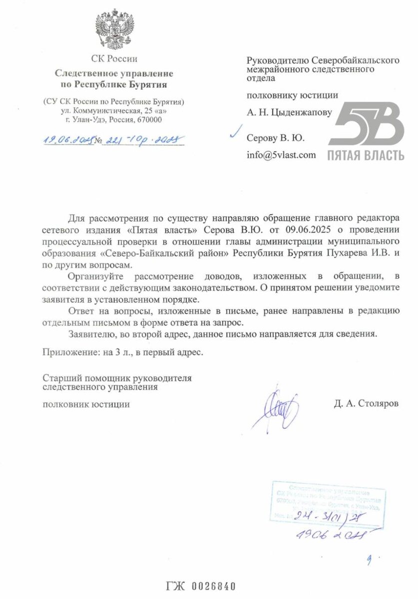 После публикации «Пятой власти» следователи займутся Пухаревым: начали проверку главы Северо-Байкальского района Резонансное расследование «Пятой власти» дало результат: руководителю Северобайкальского межрайонного следственного отдела поручено организовать процессуальную проверку в отношении главы администрации Северо-Байкальского района Бурятии Игоря Пухарева. Проверка проводится по доводам, изложенным в поступившем обращении от редакции «Пятой власти», и охватывает также ряд сопутствующих вопросов. Напомним, ранее «Пятая власть» опубликовала материал, в котором рассказала историю главы посёлка Новый Уоян в Бурятии Ольги Ловчей. По данным издания, после отказа участвовать в сомнительных схемах районной администрации она оказалась под уголовным преследованием. Собранные редакцией документы и свидетельства указали на возможную личную заинтересованность Пухарева и коррупционные практики в районе. Теперь слово за следствием. «Пятая власть» продолжает следить за ситуацией. 🤩Подписа