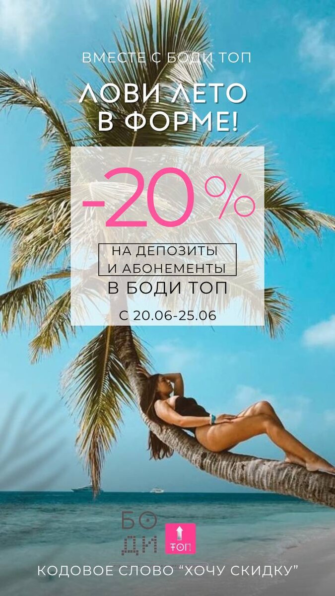 🌞 Всё, что нужно для фигуры к лету — уже здесь! С 20 по 25 мая: ✅20% на абонементы ✅и 20% на все процедуры при пополнении депозита от 15 000₽ Массажи, уходы, эпиляция — выбирай комфорт, а мы позаботимся об остальном. Напиши в ответ «ХОЧУ СКИДКУ», и мы всё расскажем и подберём для тебя подходящее 💆♀️✨ https://n960947.yclients.com 💪 А если хочешь добавить тренировок — в БОДИ ФИТНЕСЕ действует акция — 20% на абонементы. 📲 Переходи в WhatsApp и напиши *ХОЧУ СКИДКУ*: https://clck.ru/3MBBwU ➡️Ссылка для записи на тренировки https://n1159225.yclients.com