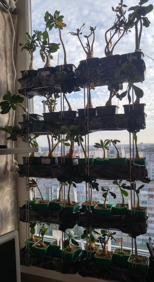 Да в начале 13 года у меня имелась кучка сеянцев адениумов, росли они все по разному кто то быстрее кто то медленнее, кроме них было не мало забот и о главном цветочки жизни. Но при еэтом вполне себе коллекция цветов потихоньку увеличивалась, мне присылали посылки с черенками отводками и растениями, я отправляла детей своих растюшек по просторам нашей огромной страны. ХМАО, ЯНАО, Ленинградская область, москва и юг, куда только не уходили от меня различные растительные посылки. Ну и мне добиралось не мало, несколько раз почтой работал супруг отвозя во время командировки в Санкт- Петербург кулечки с цветами и привозя обратно другие растения мне. Как сейчас помню первый такой сбор чемодана. Я: Дорогой тебе вот этот мешок надо в чемодан положить там встретишься с Танечкой и отдашь, она тебе другой передаст назад мне привезешь. Муж: Я уже собрал чемодан там место кончилось... Я: Где, у тебя вещей на пол чемодана всего, где там место кончилось? Муж: сама смотри..... проходит 20 минут Пакет