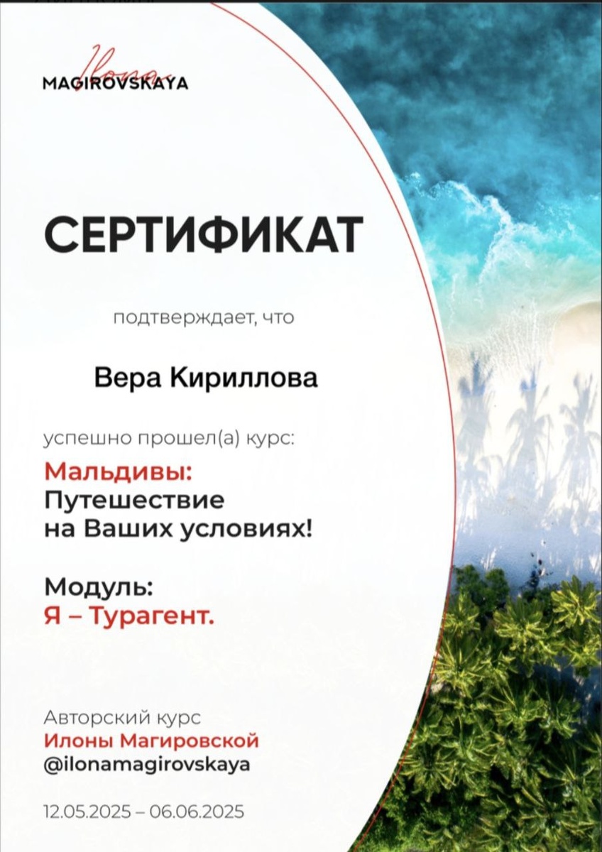 С огромной радостью сообщаю о получении сертификата по авторскому курсу, посвященному Мальдивам! 🙂 Обучение проходило у настоящего эксперта, глубоко знающего все тонкости и нюансы каждого курорта, это значительно расширило мои знания в этой области.