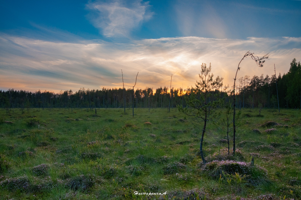 Прекраснейший вечер,с пением птиц,красивым видом цветущей клюквы на болоте и кучей комаров. Красота заката, легкий ночной туман.