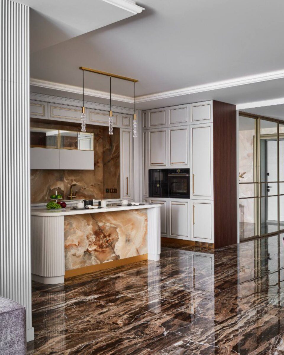 Здесь собираются друзья, обсуждают идеи за чашкой чая на мраморной столешнице, а мягкие кресла и светильники добавляют тепла и уюта. В каждой мелочи — умение говорить без слов о безупречном вкусе и статусе.
