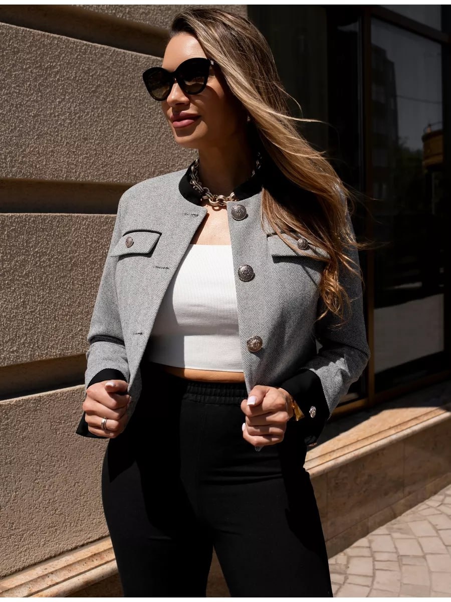 Стильный жакет прямого кроя. Фасон с длинными рукавами и накладными карманами-обманками. Сочетает в себе строгость и женственность одновременно. Идеальный вариант для любого случая – от офисной встречи до вечеринки.