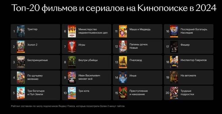 Онлайн-кинотеатр Кинопоиск подвел итоги 2024 года и поделился списком фильмов и сериалов, которые чаще всего смотрели на этой платформе. Первое место заняло шоу "Триггер". Кроме того, в топ-20 попал сериал "Последний богатырь. Наследие", который начал выходить в конце сентября. 1.Триггер; 2.Холоп 2; 3.Беспринципные; 4.По щучьему велению; 5.Три богатыря и Пуп Земли; 6.Министерство неджентльменских дел; 7.Игры; 8.Внутри убийцы; 9.Иван Васильевич меняет все; 10.Три кота; 11.Маша и Медведь; 12.Папины дочки. Новые; 13.Пчеловод; 14.Иные; 14.Преступление и наказание; 15.Последний богатырь. Наследие; 16.Фишер; 17.Инспектор Гаврилов; 19.На автомате; 20.Трудные подростки Кроме того, Кинопоиск отчитался об увеличении аудитории за год на 30% — фильмы и сериалы в онлайн-кинотеатре смотрят около 14 млн подписчиков в месяц. Среднее время просмотра выросло на 25%, а за год на одного подписчика приходится около 34,6 тайтлов и 11 спортивных трансляций. Всего в 2024 году зрители насмотрели в сервисе 4