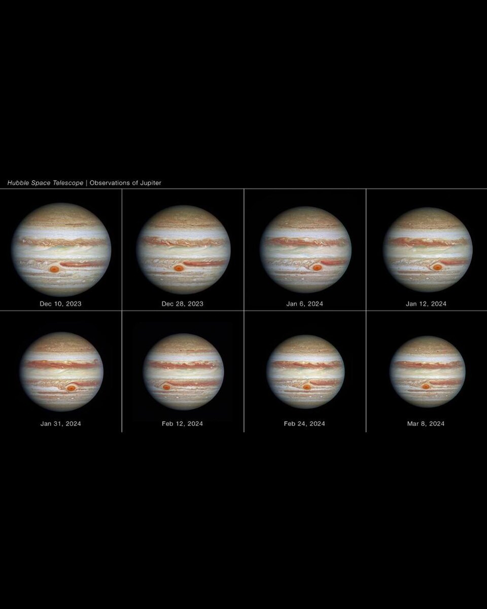 Наш лучший снимок с телескопа «Хаббл» демонстрирует наблюдения за Юпитером. В рамках программы OPAL космический телескоп NASA/ESA Hubble в течение 90 дней отслеживал динамику Юпитера и его знаменитого красного шторма — гигантского антициклона, способного полностью поглотить Землю. Наблюдения показали, что Большое Красное Пятно не является стабильным образованием. В течение 90-дневного цикла наблюдений шторм колебался подобно желе. Причина этих колебаний остаётся загадкой для ученых.
