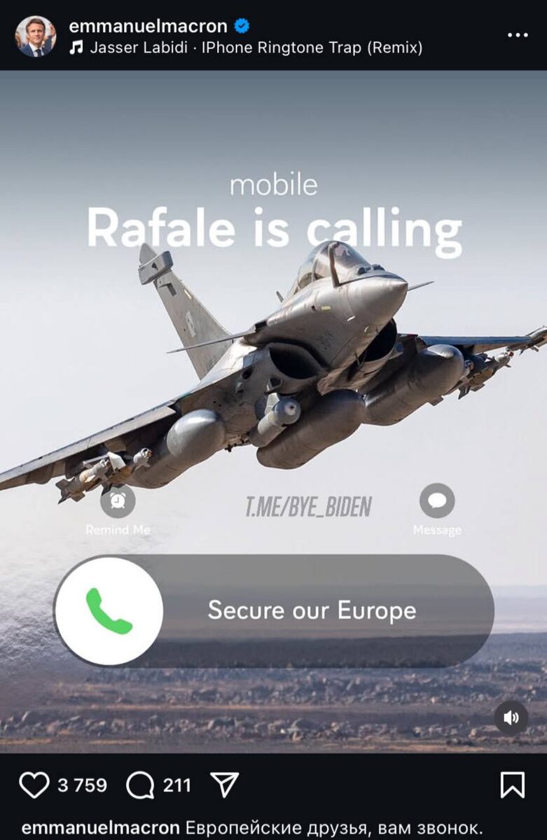 «Европейские друзья, вам звонок» Макрон уже сам шутит на тему телефонных звонков. Выставил в соцсети «входящий звонок» от лица французского истребителя «Рафаль». «Обезопасить нашу Европу», — так гласит кнопка принятия «вызова». К чему это он? 👍 БайБайден. Подписаться