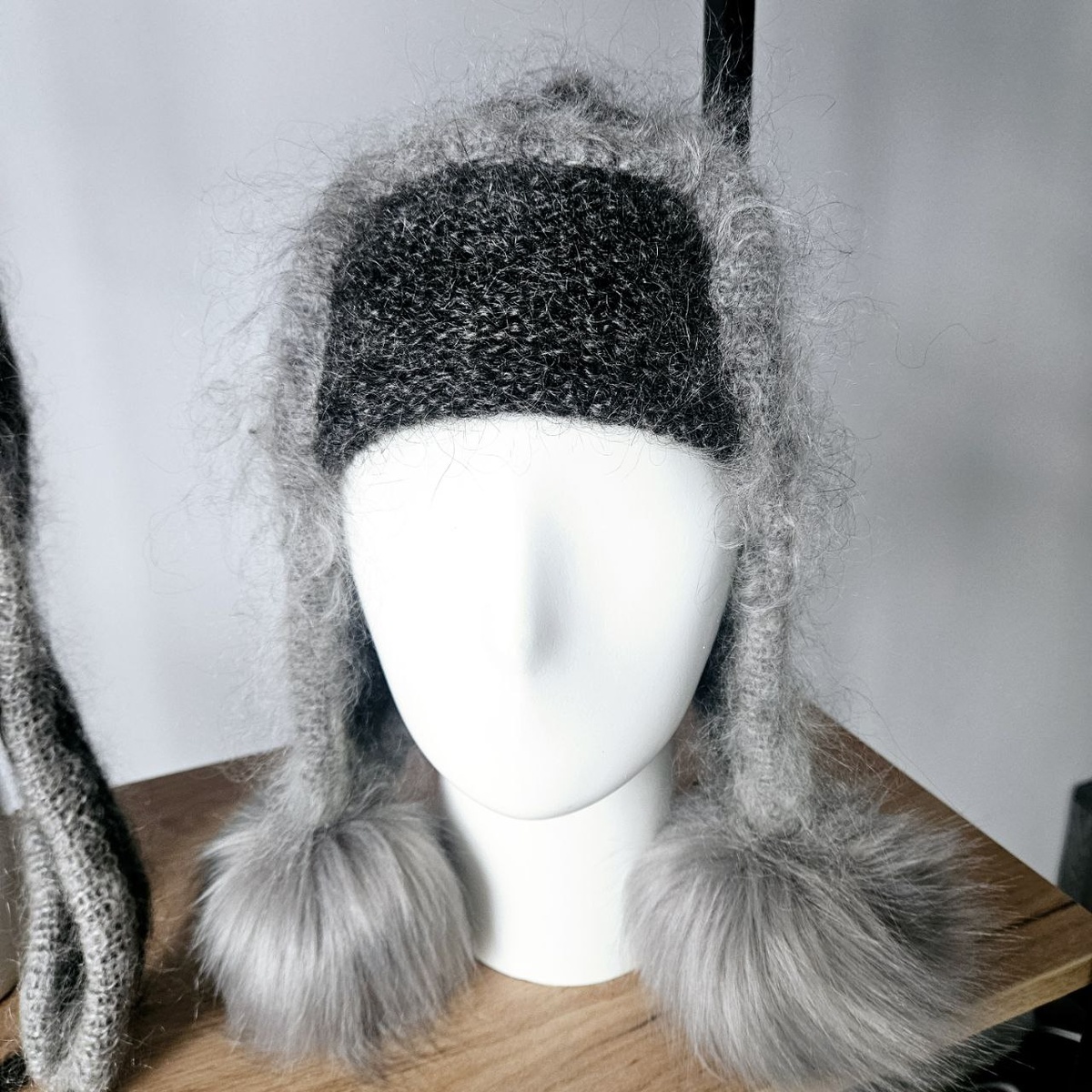 Вот на этих 2 ушанках чётко видно разницу в пухе. Тёмный пух, это скорее всего, горный пух или ангора, серый га ушанке без помпонов-это он-же. Серый пух для этой шапки я взяла из бобины серого цвета, так называемой,, пряжа на тонкую, цвет голубая норка,, Цена такого пуха 2500-2800 за бобину 400г. Вот так он смотрится в изделиях На ушанке с помпонами серый пух на отделке-это пух моих придонских коз. Вы должны чётко развидеть разницу. Смотрите на серую отделку Связано абсолютно одинаково, толщина пряжи одинаковая, а результат совсем другой. Это наш знаменитый придонский пух, который увеличивает свой объем в несколько раз Наглядный пример