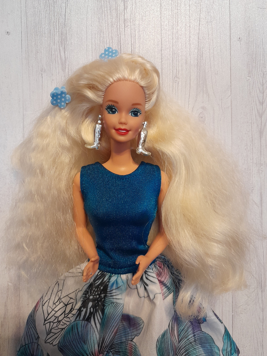 Это я о новеньких своих)) Сколько я ни пыталась проанализировать и определить основные критерии заселения новеньких куколок в коллекцию, все сводится к одному: понравилась➡️полюбилась💖💖💖 Часто бывает так, что я откладываю куколку в Избранное, а потом понимаю-не моё. А вот если она возвращается туда снова и снова, значит, судьба) Это потом уже разум начинает поиск оправданий чувствам) Казалось бы, сколько у меня блондинок-суперстарок в коллекции? Много! Больше других молдов) А вот приехала ещё одна: Знакомьтесь с Бренди) Барби western stampin' 1993 года. Ещё одна ковбойша)) Оправдание разума: это все Полли наподмигивала😉😉😉 Приехала девочка ко мне нюд, но в родных сережках в виде сапожков. Меня покорили её озорные глазки, из-за особенности рисовки они, как у лисички: Волосам мы провели спа-процедуры с бальзамом, гофре сохранилось) Синеглазка моя😍😍😍 Далее расскажу о Трейси. Это Барби party time 1994 года выпуска на молде Тереза. Оправдание разума: у меня есть Тереза Маки, Хиспа