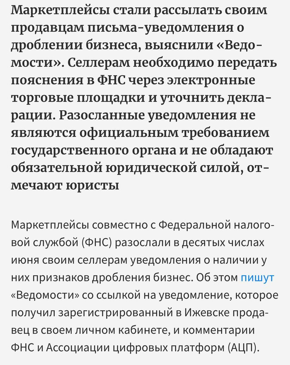 Впервые слышим о том, что маркетплейс сам рассылает письма кому-то о дроблении. Проверяйте колокольчики, кто грешен. Полная версия здесь https://www.forbes.ru/biznes/539810-vedomosti-uznali-o-pis-mah-po-povodu-droblenia-biznesa-prodavcam-ot-marketplejsov?ysclid=mc1k6fauy6336841242