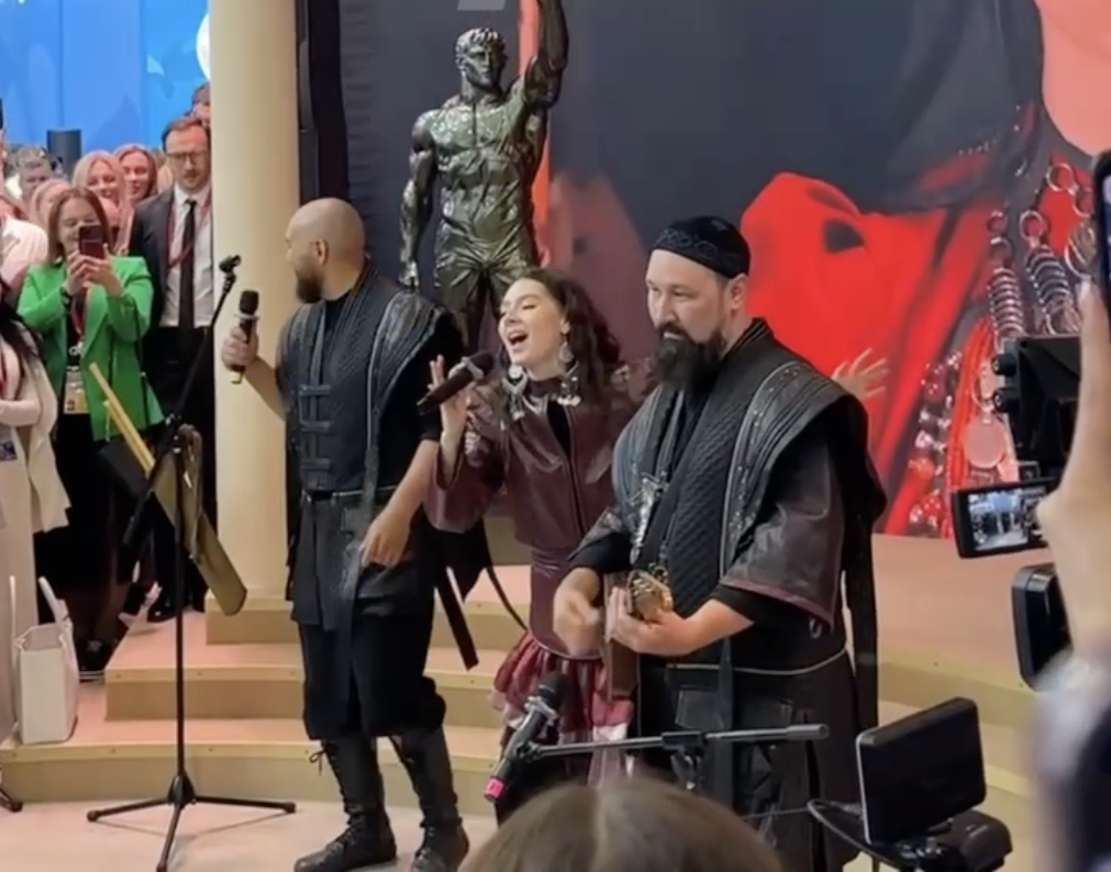 Ажиотаж у стенда Башкортостана — там выступают звёздочки из группы Ay Yola. Увидеть их в такой толпе сложно, зато слышно на весь павильон G.