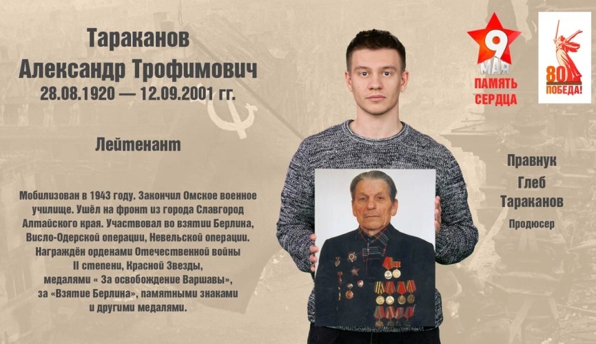 К 80-летию Победы в Великой Отечественной войне MIR24.TV продолжает проект «Наша память сердца», который посвящен подвигам родственников сотрудников Межгосударственной телерадиокомпании «Мир». Память о своих героях хранит почти каждая семья, поэтому в цикле наших статей принимает участие большая творческая команда: корреспонденты, редакторы и телеведущие, продюсеры и операторы, звукорежиссеры и монтажеры, а также многие другие. Все они говорят о славном боевом прошлом своих дедов и прадедов, о тех, кто прошел через долгий путь испытаний и вернулся домой, чтобы рассказать потомкам, как ковалась великая Победа. Александр Трофимович Тараканов и Иван Данилович Филиппов — родные прадедушки продюсера информационных программ «МИР 24» Глеба Тараканова — прошли долгий боевой путь и принимали участие в важнейших сражениях Великой Отечественной войны, в перечне их наград — ордена, памятные знаки и государственные медали. «Александр Трофимович Тараканов родился 28 августа 1920 года в деревне Дуба