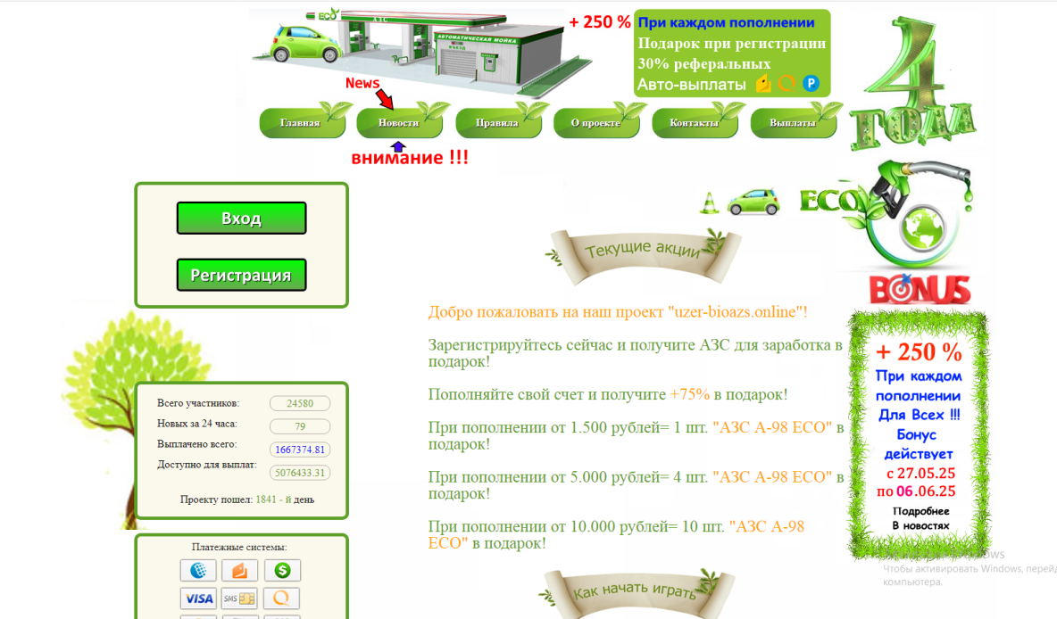 Uzer-Bioazs (https://uzer-bioazs.online/) предлагает пользователям зарегистрироваться и получить АЗС (автоматизированные системы заработка) в подарок, а также обещает бонус в 250% при пополнении счета. Проект подчеркивает стабильный доход и бесперебойные выплаты, что может заинтересовать тех, кто ищет простые способы заработка. На сайте упоминаются конкурсы рефералов и разделы новостей и правил, что создает видимость активности.