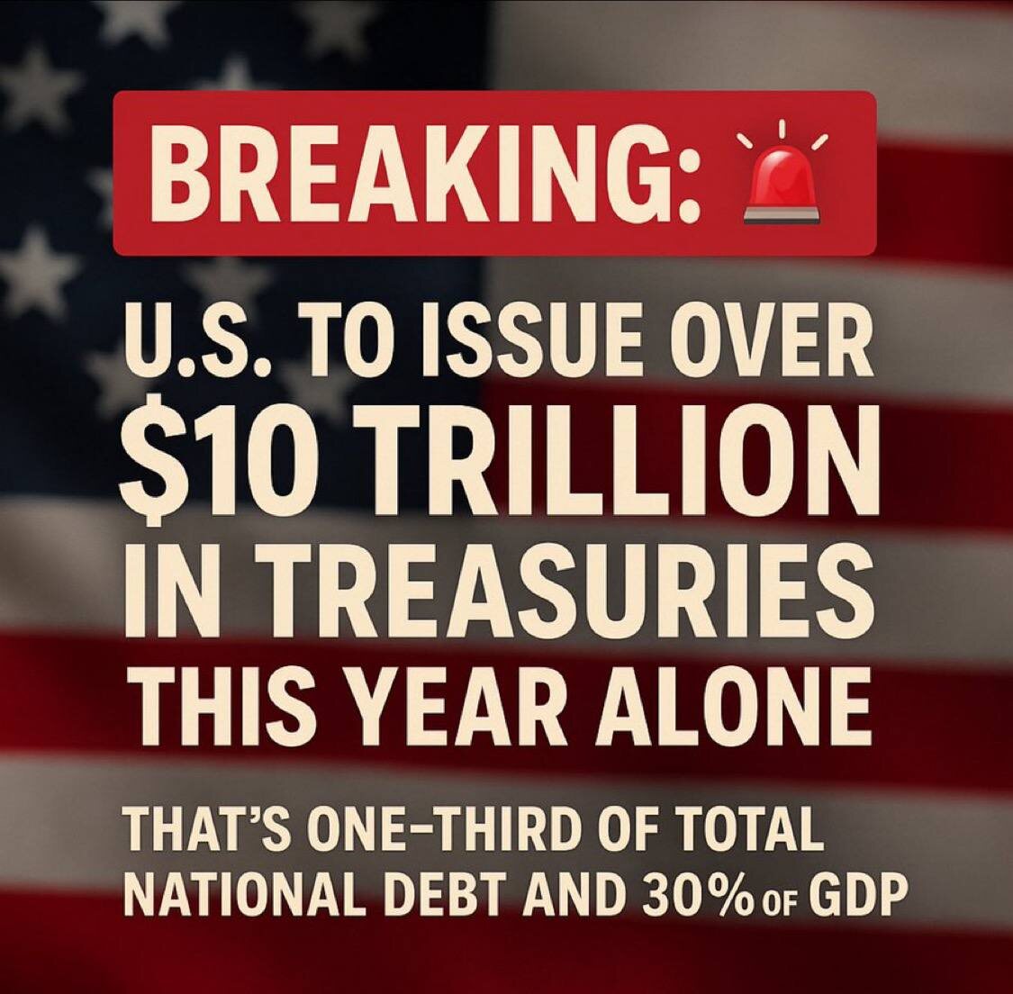 🚨 BREAKING: The U.S. is set to unleash over $10 TRILLION in Treasuries this year! That's a whopping third of our national debt and 30% of GDP! 💰 📈