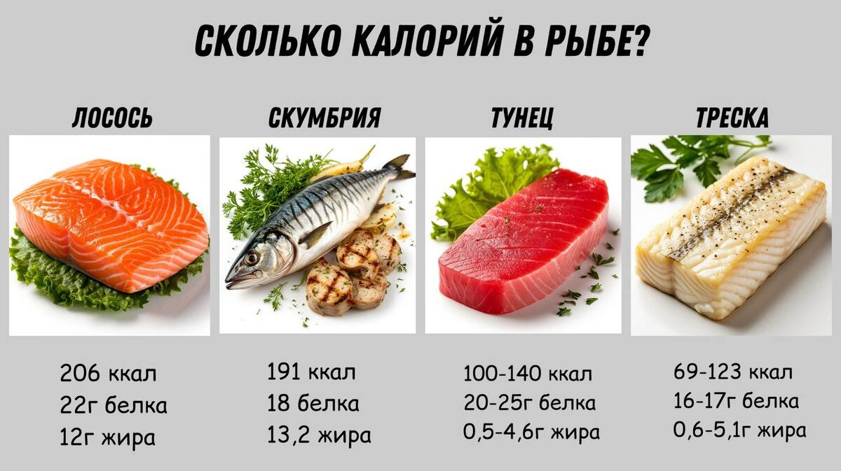 Отлично, разберёмся с калорийностью разных видов рыбы! 😊 Это действительно ценный продукт для вашего рациона, богатый белком и полезными жирными кислотами. Однако их энергетическая ценность существенно варьируется. Давайте сравним несколько популярных вариантов: 🔹 Лосось: отличается высоким содержанием полезных жиров, что обеспечивает отличное насыщение и делает его очень питательным. Идеален, когда нужно надолго утолить голод. 🎣 🔹 Скумбрия: обладает умеренной жирностью, приятным вкусом и несомненной пользой для здоровья. 🔹 Тунец (особенно консервированный в собственном соку): Практически чемпион по содержанию белка при минимальном количестве жира. Прекрасный выбор при необходимости строго контролировать калорийность рациона🥫 🔹 Треска: Признанный лидер по низкой калорийности среди рыб. Легко усваивается и при этом остаётся отличным источником качественного белка. ⚖️ Ключевой совет: 🎯 Подбирайте сорт рыбы, ориентируясь на ваши задачи: для максимального насыщения, для периода огр