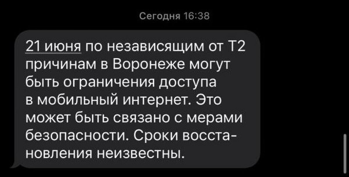 Сотовый оператор Т2 сообщил воронежцам о предстоящем отключении интернета 21 июня. Предупреждение вышло в формате СМС-рассылки. Сегодня, 20 июня, многие воронежцы получили оповещения о предстоящем отключении мобильного интернета. В сообщении говорится, что доступ к сети ограничат в субботу. Это может быть связано с мерами безопасности, о чем ранее сообщали в правительстве Воронежской области. Сроки восстановления связи неизвестны. Напомним, сегодня утром, 20 июня, в регионе вновь отключали мобильный интернет. По всей видимости, ограничения были связаны с действующим режимом опасности атаки БПЛА. Ранее, 17 июня воронежцы в течении почти всего дня испытывали трудности с доступом к мобильному интернету. Горожане не могли оплачивать картой поездки на общественном транспорте, совершать покупки в магазинах, пользоваться парковкой, а также вызвать или оплатить такси. Подробнее о массовом сбое, а также возможных путях решения проблем с мобильным интернетом можно прочитать в материале «ВН».