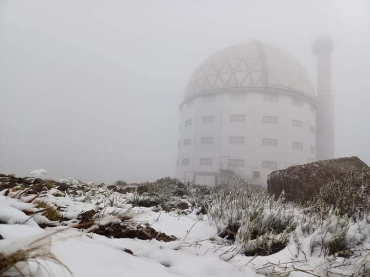 Южноафриканский большой телескоп, крупнейший оптический телескоп в южном полушарии в Сазерленде, Северный Кейп, покрыт снегом, из-за холодного фронта над страной. Телесклп находится в примерно 300 км от Намибии. Южноафриканский большой телескоп (SALT) — это 9,2-метровый оптический телескоп, разработанный в основном для спектроскопии. Он состоит из 91 шестиугольного зеркального сегмента, каждый с вписанным диаметром 1 метр, в результате чего получается общее шестиугольное зеркало размером 11,1 на 9,8 м. Однако его эффективная апертура составляет всего 9,2 м. Он расположен недалеко от города Сазерленд в полупустынном регионе Кару, Южная Африка. Это объект Южноафриканской астрономической обсерватории, национальной оптической обсерватории ЮАР. SALT — крупнейший оптический телескоп в южном полушарии. Он позволяет проводить спектроскопический и поляриметрический анализ и получать изображения излучения астрономических объектов, которые находятся вне досягаемости телескопов северного полушари