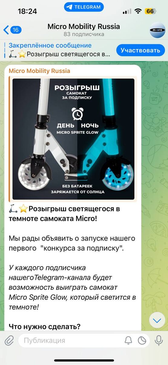 Новый легкий двухколесный самокат - желанный подарок для активных детей и их родителей. Самокат бренда Micro - транспорт, который переходит из сезона в сезон. Он помогает не только сделать передвижение по городу мобильным и комфортным, но и организовать активные прогулки на свежем воздухе. Поэтому его так любят не только дети, но и родители. Но, почему бы не попытать счастье и не попробовать его выиграть? В связи c активной деятельностью на своих каналах и пополнением ассортимента в этом сезона, компания Micro Mobility Russia проводит свой первый розыгрыш в Telegram на новую модель Micro Sprite Glow. Для участия необходимо быть подписанным на https://t.me/micromobilityru и делиться конкурсным постом https://t.me/micromobilityru/76 с друзьями.