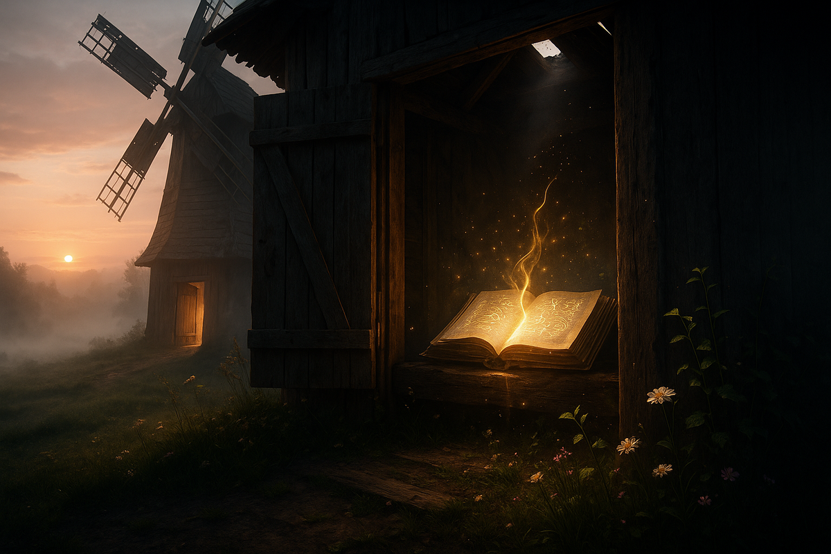 Первый луч солнца сорвался из-за горизонта и, пробежав по росе и траве, скользнул внутрь мельницы. Сначала он прочертил яркую полосу по пыльному полу, потом поднялся выше и лёг прямо на разворот книги. Пожелтевшие страницы вспыхнули тёплым светом. В тот же миг Кирик ощутил едва уловимую вибрацию, исходящую от манускрипта — словно книга просыпалась.