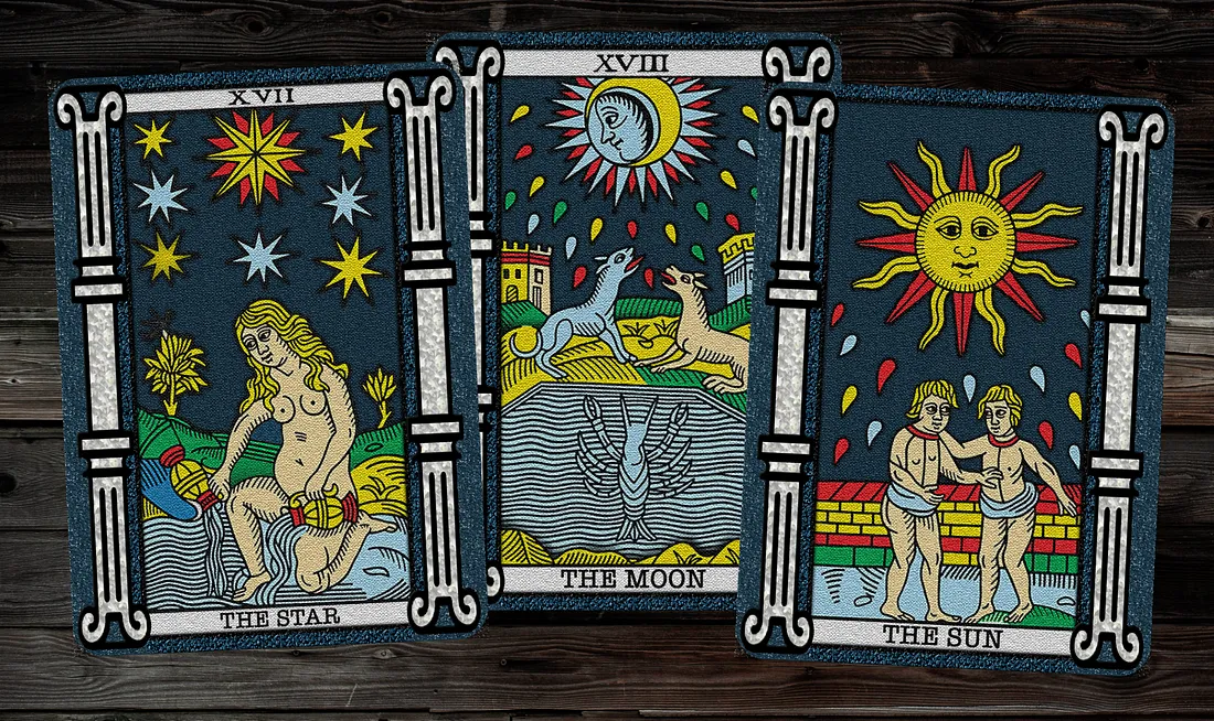 Пятёрка Пентаклей · Колесница · Двойка Кубков · Девятка Жезлов