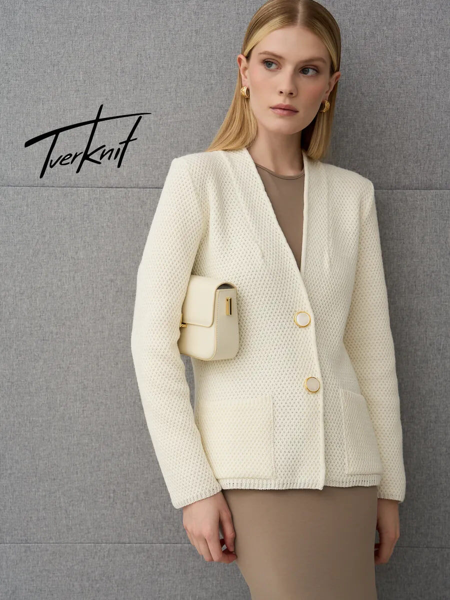 Классическая приталенный вязаный кардиган . Фасон без воротника и длинными прямыми рукавами. Подойдёт практически к любому образу.