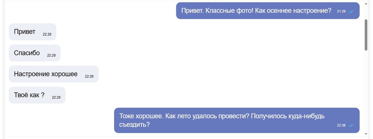 Всем доброго времени суток. Вот и очередная порция переписок. И как обычно: Переписки специально выкладываю без каких-либо указаний на личность собеседницы, чтобы никого нельзя было персонифицировать. На скриншотах те реплики, которые белыми буквами на фиолетовом фоне - это мои слова. Если под репликой две галочки не закрашены голубым - значит собеседник не видел и не прочитал сообщение. Переписка № 11 Переписка № 12 Последняя реплика показалась мне странной - поэтому я решил закончить общение. Переписка № 13 Переписка № 14 Так как девушка общалась очень странно, то я решил прервать переписку - не нравится мне такой стиль общения. Я думал выкладывать переписки по пять штук, но следующая переписка - очень длинная, поэтому я ей уделю отдельную статью. Это раньше я еще мог долго общаться в сети сообщениями, но потом решил, что надо ограничить этого процесса, потому что и времени много уходит, и результата в виде реальной встречи никакого. Спасибо за внимание!