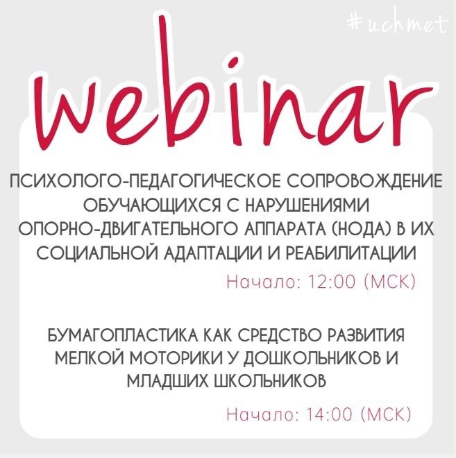 21 июня общеобразовательный портал "УчМет" проводит 2 бесплатных вебинара: Вебинар «Психолого-педагогическое сопровождение обучающихся с нарушениями опорно-двигательного аппарата (НОДА) в их социальной адаптации и реабилитации» Начало: 12:00 (МСК) https://www.uchmet.ru/events/item/3880449/ Вебинар «Бумагопластика как средство развития мелкой моторики у дошкольников и младших школьников» Начало: 14:00 (МСК) https://www.uchmet.ru/events/item/3880452/