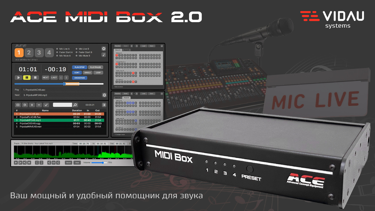 Представляем обновленную версию нашего популярного устройства ACE MIDI Box 2.0. Мы значительно улучшили медиаплеер, сделали управление проще, а дизайн – ещё стильнее и эргономичнее. Это идеальное решение для автоматизации эфира на радио и ТВ, для музыкантов, диджеев и всех, кто хочет работать с качественным звуком максимально удобно.