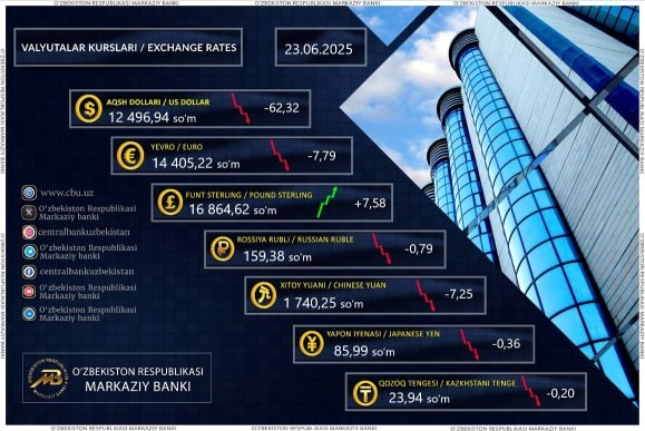Курс российского рубля снизился на 0,79 сум, составив 159,38 сумов. Курс китайского юаня упал на 7,25 сум, достигнув отметки 1 740,25 сумов. Японская иена потеряла в цене 0,36 сум, торгуясь по 85,99 сумов. Казахский тенге также ослаб на 0,20 сум, установившись на уровне 23,94 сумов.