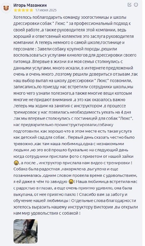 Ни одного слова от себя🙌 Цитируем отзыв и благодарим за доверие❤️. ⬇️⬇️⬇️ "Хотелось поблагодарить команду зоогостиницы и школы дрессировки собак " Люкс " за профессиональный подход к своей работе ,а также руководителя этой компании, ведь хороший и ответсвеный коллектив это заслуга руководителя компании! А теперь немного о самой школе,гостинице и персонале : Завели собаку крупной породы ,решили воспользоваться услугами кинологов для дрессировки своего питомца. Впервые в жизни я и моя семья столкнулись с данными услугами, много искали, в интернете предложений очень и очень много ,поэтому решили довериться отзывам ,так наш выбор выпал на школу дрессировки " Люкс" позвонили, записались,по приезду нас встретили сотрудники школы,мы много чего узнали полезного,а также многие вещи которым многие не придают внимания ,а это как оказалось важно ,теперь мы ходим на занятия с инструктором ,в процессе тренировок у нас появилась необходимость уехать на 4 дня ,так мы впервые столкнулись с гостиниц