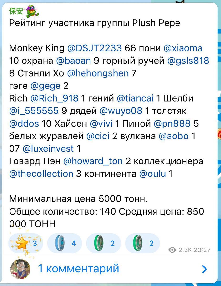 19 разных китайских коллекционеров приобрели себе Plush Pepe и ввели свой внутренний рейтинг внутри канала😂