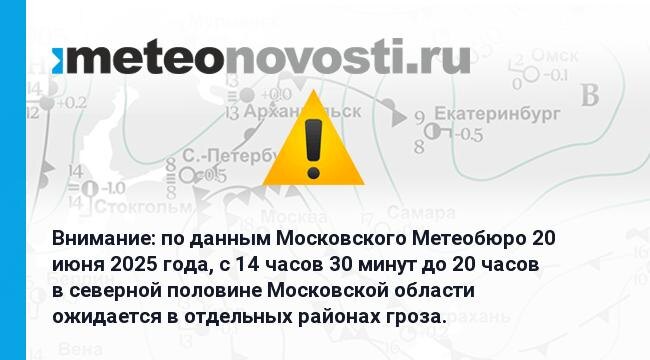Внимание: по данным Московского Метеобюро 20 июня 2025 года, с 14 часов 30 минут до 20 часов в северной половине Московской области ожидается в отдельных районах гроза. Перейти на сайт Прогноз погоды на 14 дней