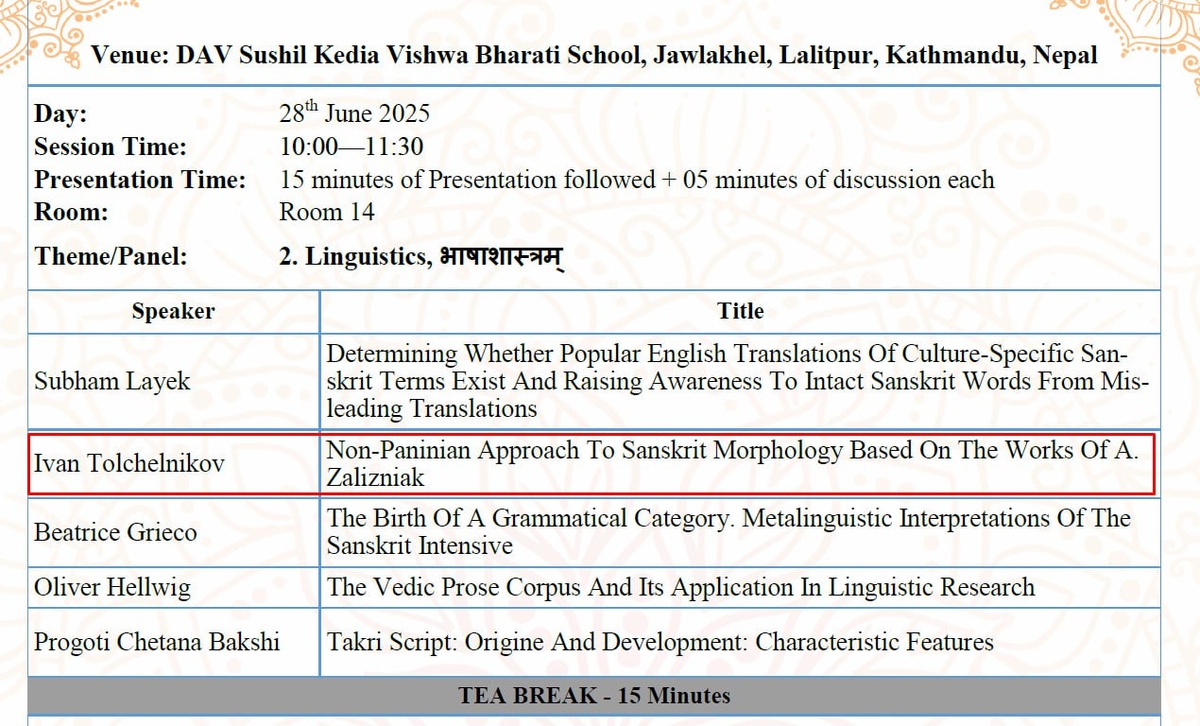 🗣 ДВОЕ РЕВНИТЕЛЕЙ НА WSC 2025 28-го июня Иван Толчельников выступит на всемирном съезде санскритологов в Катманду про Зализняка как санскритолога и https://samskrtam.ru/z, полная программа выступлений прилагается. Стрима докладов не будет, выступление запишем сами на месте, шестеро ревнителей санскрита на днях достигнут Непала. Того же дня, 20 минут после Ивана, 28-го июгя, о рукописи Хорапрадипа в разделе индийской астрономии выступит Наташа Федорова, аспирант филфака МГУ. 19th WORLD SANSKRIT CONFERENCE 2025 KATHMANDU, NEPAL 26th - 30th June 2025 см. полную программу на 105 стр. https://vk.com/wall-88831040_24370