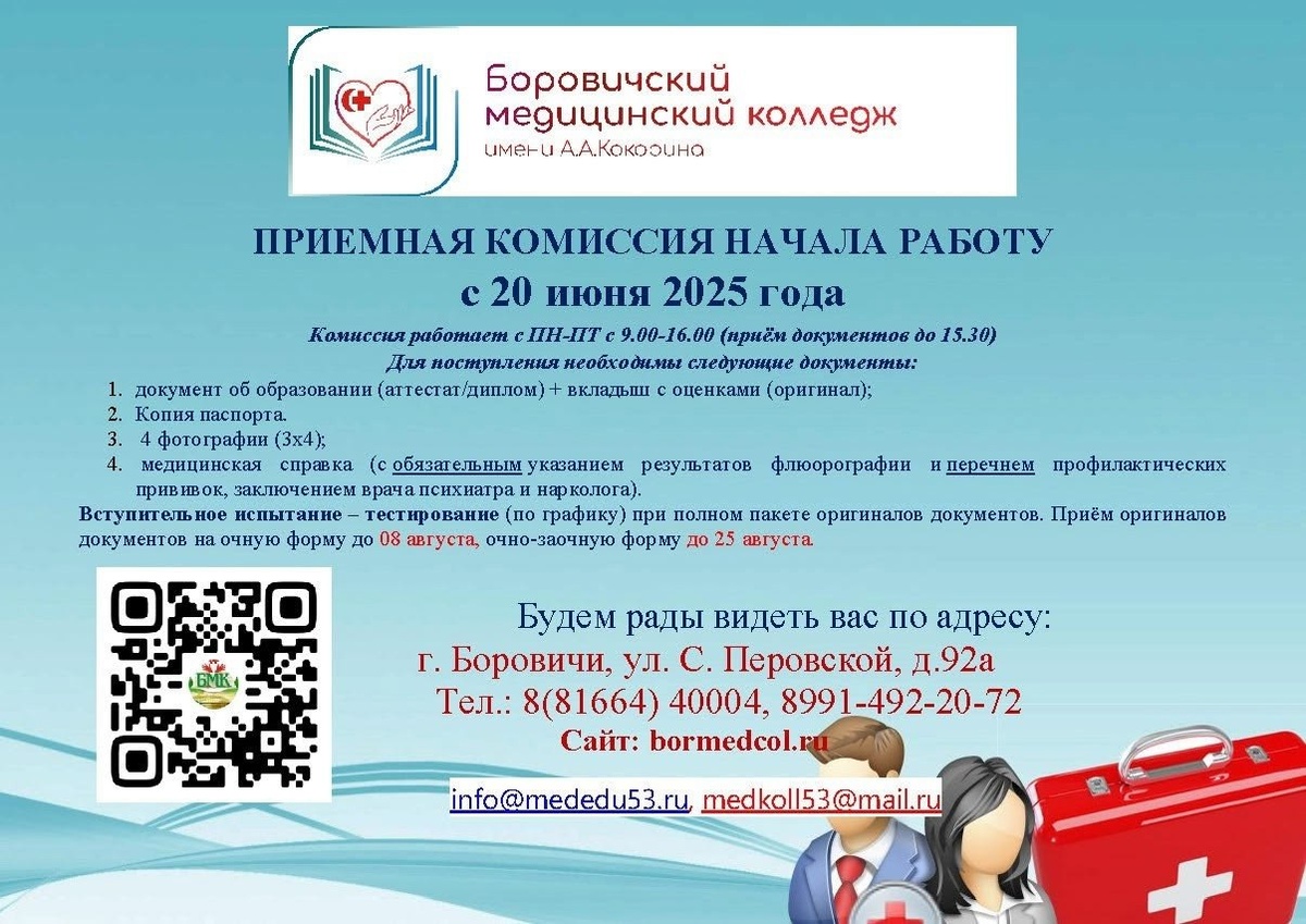 Боровичский медицинский колледж имени А.А. Кокорина ждёт абитуриентов! Подробнее о работе приёмной комиссии на сайте колледжа: https://mededu53.ru/priemnaya-komissiya #Образование_Окуловский #Профориентация_КО_Окуловский #ЕГЭОкуловский #ГИА9Окуловский #Учимсядома
