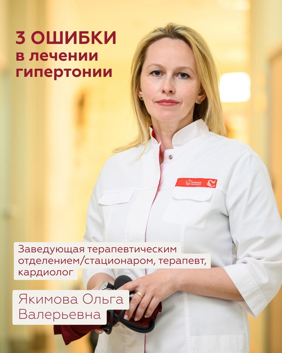 ❤️ Гипертония – коварное заболевание, требующее внимательного и ответственного подхода к лечению. К сожалению, многие пациенты допускают ошибки, которые сводят на нет все усилия. Заведующая терапевтическим отделением, врач-терапевт, кардиолог с 23-летним стажем Якимова Ольга Валерьевна собрала три самых распространенных промаха. ◾ Ошибка №1. Отмена или изменение дозировки лекарств Многие, почувствовав улучшение, решают, что можно бросить пить таблетки или снизить дозу. Такая беспечность способна привести к резким скачкам давления и более серьезным последствиям (инсульт, инфаркт). ◾ Ошибка №2. Игнорирование здорового образа жизни Лекарства помогают контролировать давление, но активный образ жизни – это фундамент здоровья сердца и сосудов! Соблюдайте диету с ограничением соли и жиров, занимайтесь физкультурой, откажитесь от курения и алкоголя. ◾ Ошибка №3. Нерегулярный контроль давления Брать в руки тонометр только когда плохо – недостаточно. Измеряйте давление утром и вечером, а также